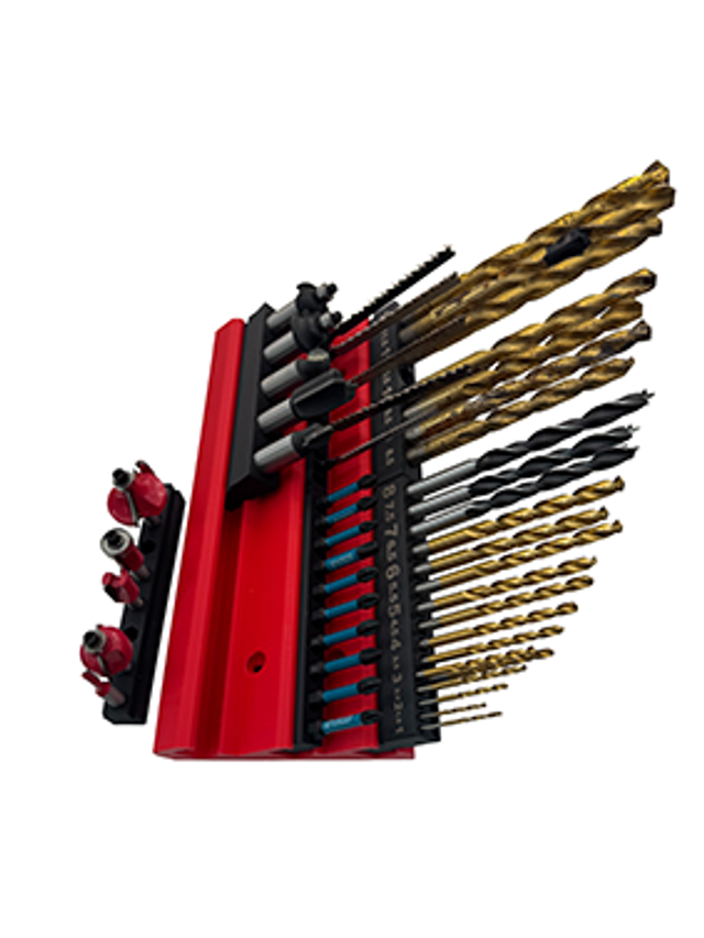 Version 1 - Holds 10 racks in 5 rows of 2 - 2 x drill bit racks for 1mm - 12mm drill bits (10mm plus are all 10mm holes as most sets the shanks top out at 10mm) + 1 x T-shank Jigsaw blade rack (holds 15 blades) + 2 x 1/2" router bit racks + 5 x Hex Bit racks (also fit 1/4" router bits.